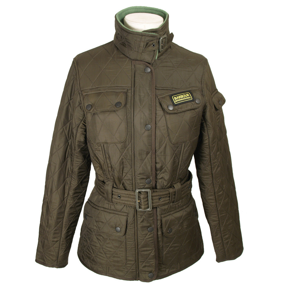 Barbour International Polarquilt in olive. Part of Barbours highly acclaimed Heritage collection this iconic diamond quilted jacket features four front press studded pockets and one on the arm, a funnel collar with adjustable buckle fastening, zip and press stud closure and removable waist belt. Finished with a cosy fleece lining and the signature brand logo patch on the chest, this feminine take on the classic biker jacket will never go out of style and is a wardrobe essential for AW11.